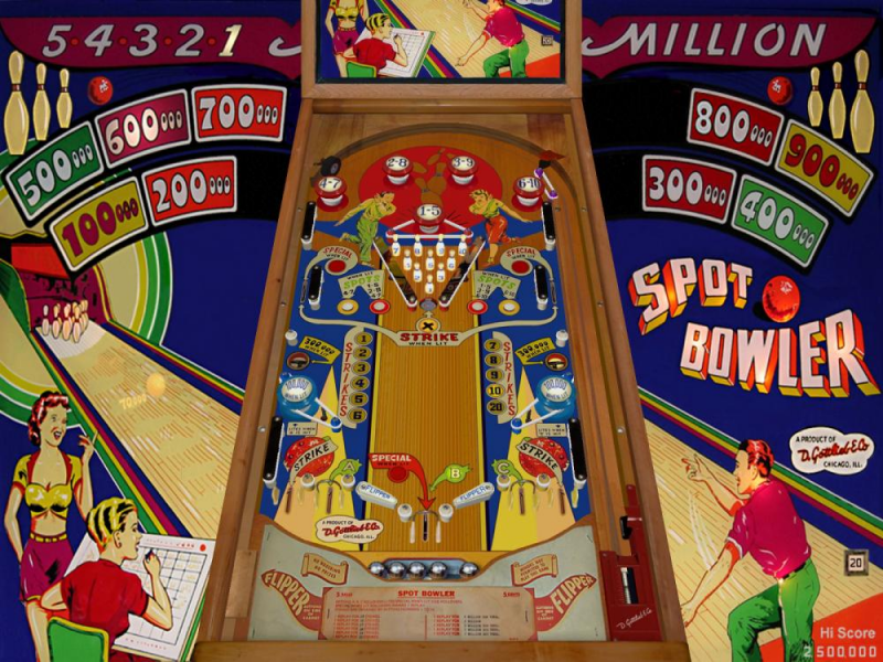 http://roguepinball.com/index.php?action=downloads;sa=view;down=491My exploration of the post-war evolution of pinball from the invention of the flipper to the mid 1960's when I was living in the pinball parlor continues with Gottlieb's Spot Bowler. Spot Bowler was released in October 1950 and was designed by Wayne Neyens with Art by Roy Parker. 1,000 Spot Bowler games were produced making it moderately rare today.