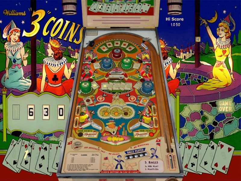 http://roguepinball.com/index.php?action=downloads;sa=view;down=356My exploration of the post-war evolution of pinball from the invention of the flipper to the mid 1960's when I was living in the pinball parlor has so far pretty much skipped over the transition at Williams after Harry Williams left in 1959. An online interaction brought to my attention a couple of games that reflect this transition, and so I recreated them for VP to experience what that period was like. This game, 3 Coins, was released in February, 1962 and was designed by Steve Kordek with Art by George Molentin. 1,100 3 Coin games were produced. An Add-A-Ball version of this game named Jolly Jokers had been released in January 1962, with only 700 of those games produced.