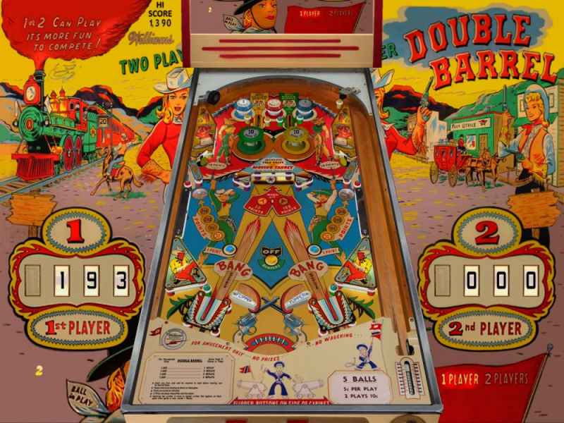 http://roguepinball.com/index.php?action=downloads;sa=view;down=358New VP9.2.0 Build of the 1961 Two Player Williams Game Double Barrel. My exploration of the post-war evolution of pinball from the invention of the flipper to the mid 1960's when I was living in the pinball parlor has so far pretty much skipped over the transition at Williams after Harry Williams left in 1959. An online interaction brought to my attention a couple of games that reflect this transition, and so I recreated them for VP. This game, Double Barrel, was released in August, 1961 and was designed by Steve Kordek with Art by George Molentin. Only 700 games were produced, so it is rare today.