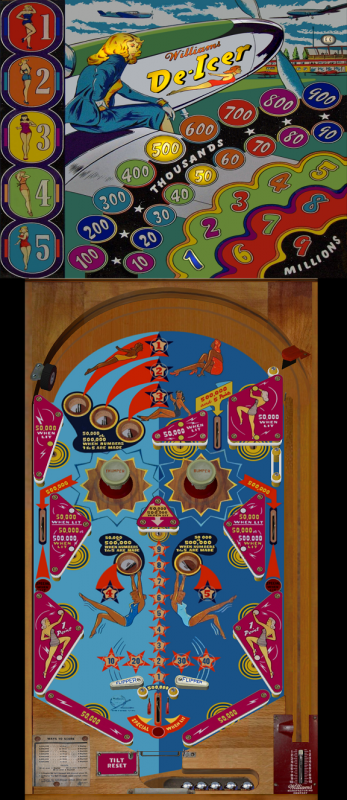 Even at this early stage of figuring out how to use flippers in his game design, you can see several of Williams' inventive directions already beginning to show. Most obvious is his use of asymmetry, something that became much more extreme in his games just a few years later. Another feature is the TILT reset which was a Williams invention and exclusive feature for several years. Harry Williams had invented the original TILT feature many years earlier, and how tilting interacted with game play (i.e. how much nudging was allowed) was something he remained focused on. De-Icer was one of the first games where tilting didn't end the game, but only the ball in play.