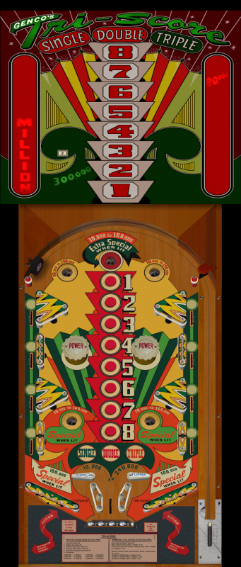 http://roguepinball.com/index.php?action=downloads;sa=view;down=494Description: In my journey of recreating electromechanical flipper pinball games, I have so far not looked at games from Genco. Genco released Tri-Score in January of 1951. IPDB indicates that the designer and artist are unknown. However, it is likely Harvey Heiss or Steve Kordek were the designers, as they were the flipper game designers at Genco at this time. It is not known how many of this game were originally produced.