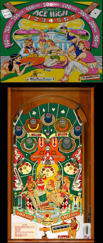 http://roguepinball.com/index.php?action=downloads;sa=view;down=510Gottlieb's Ace High was released in February 1957. Ace High was designed by Wayne Neyens with Art by Roy Parker. 2,100 units were produced so this game is only moderately rare. The Targets are special in this game, having a center pin that has to be hit squarely in order to hit a "Bulls-eye" and light the next card. You can get up to 8 specials on a single ball (9 if you happen to cross a scoring special as well). Ace High was the last Gottlieb game without a game over relay, so the flippers stay live even when the game is over.