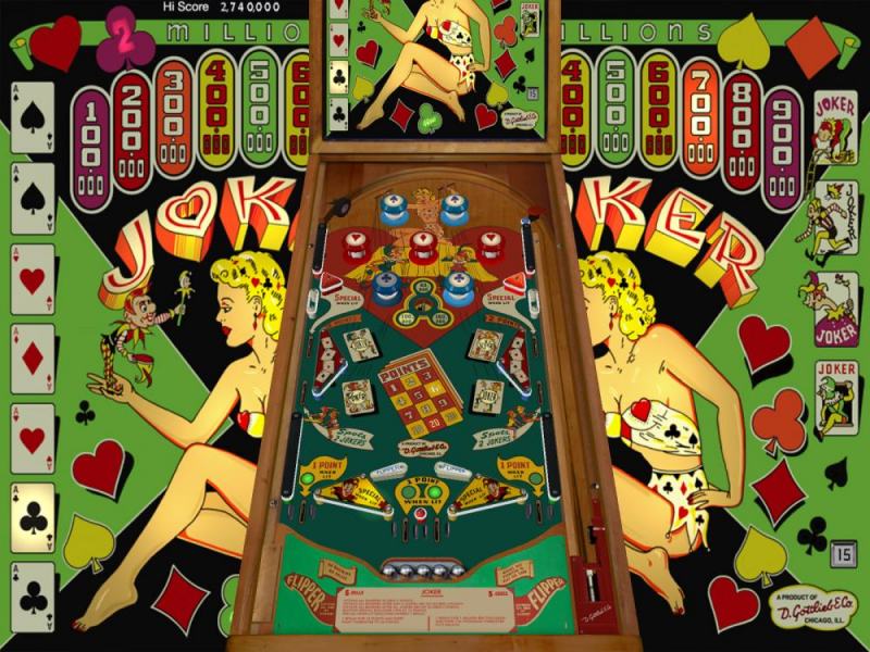 https://roguepinball.com/index.php?action=downloads;sa=view;down=700Gottlieb's Joker was released in December 1950. Joker was designed by Wayne Neyens with art by Roy Parker. Only 850 units were produced so this game is rare to find today. I chose to do Joker because it informs how flipper game design was evolving in its early days to incorporate ever more skill into the game play. The flippers are still reversed, but now at the bottom center of the playfield. The mix of dead bumpers and POP bumpers provides faster action than previous games did. The game has two sequences, Aces with the top bumpers and Jokers with the side lanes and contact switches. The two sequences are interconnected by the fact that making all aces scores 2 to 5 points based on how many jokers have been made before the last ace is made. Plus making all aces resets the scoring kicker back to 50,000. This begins adding trade offs in game strategy that may be taken. Replays can be made on high score or points, along with a special which lights when making 15 points or more. This is the time period where you could still earn many replays in a single game.