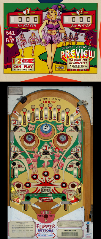 Preview Gottlieb 1962 FS DirectB2sMy exploration via recreating the early post-war games of Williams and Gottlieb to experience the evolution of flipper pinball design and innovation hands-on continues with Gottlieb's Preview. Preview was released in August 1962. Designed by Wayne Neyens with Roy Parker artwork, 1,900 Preview games were produced so this game is not very rare to find today.